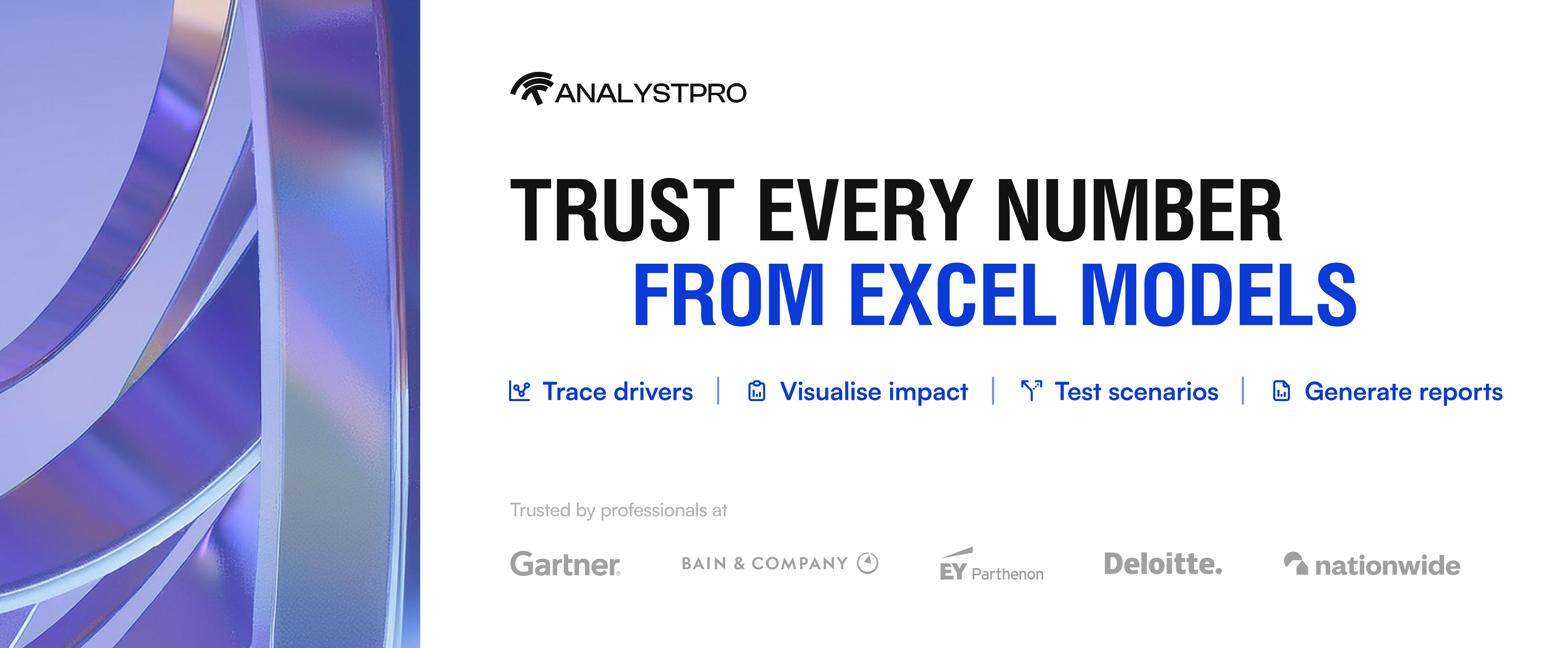 AnalystPro is the trust layer for modelling in the AI era. Its Excel add-in connects to any spreadsheet and instantly maps every formula, input, and dependency into a clear view of drivers and sensitivities - replacing hours of cell-by-cell tracing with one click.