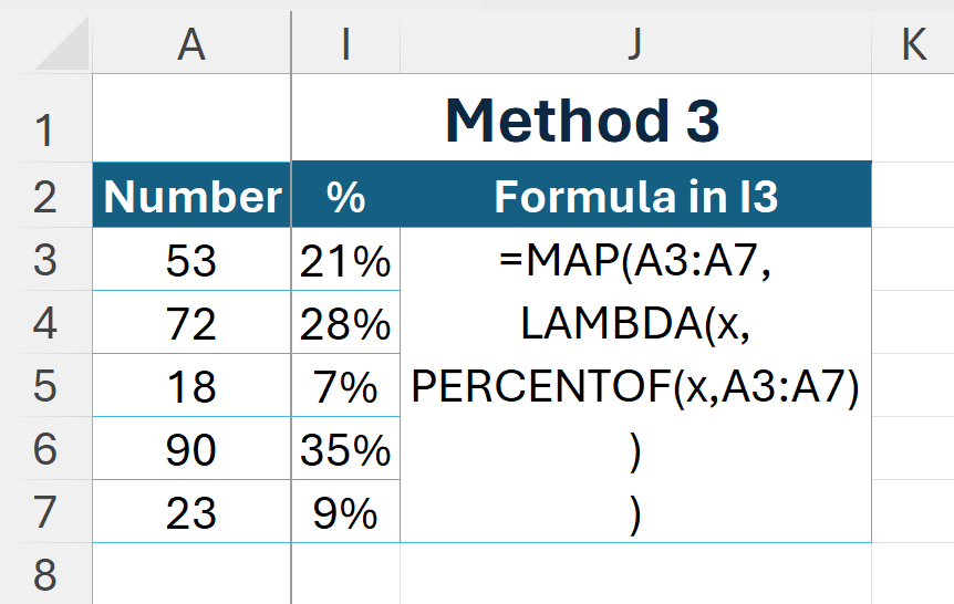 By combining PERCENTOF with MAP and LAMBDA, the numbers can be processed individually in a single formula, allowing the results to be spilled.