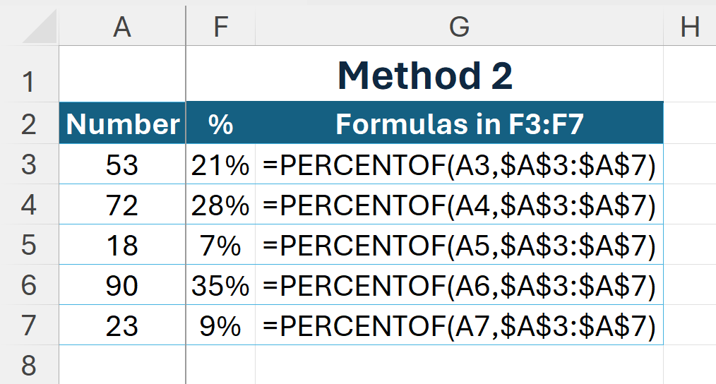 =PERCENTOF(A7,$A$3:$A$7)