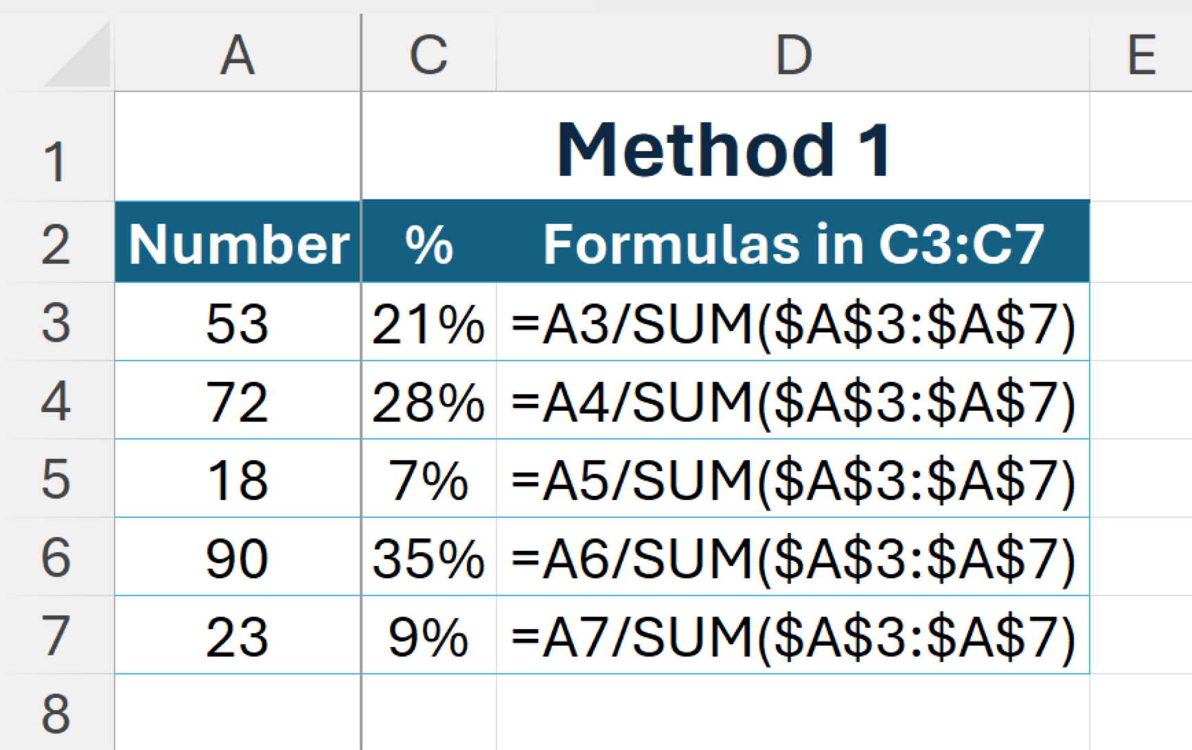 =A7/SUM($A$3:$A$7)