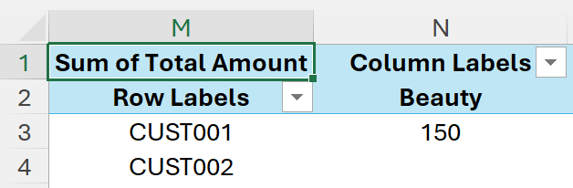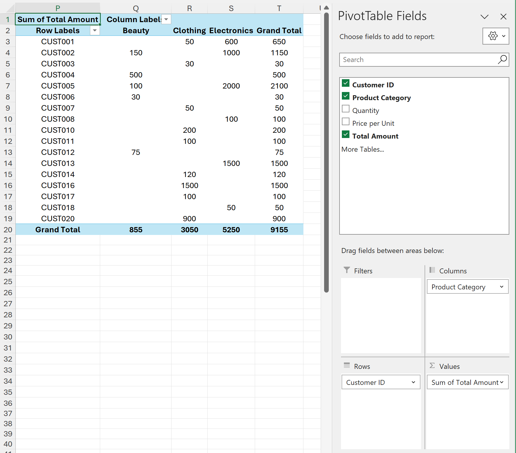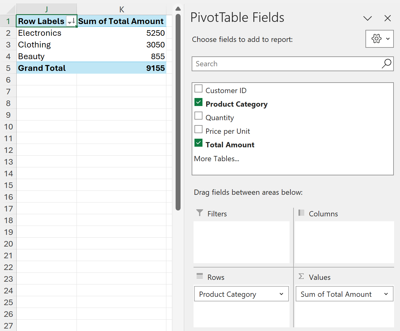 It returns the three unique values in the Product Category column and sums the Total Amount values belonging to each. The default Total row is also included.