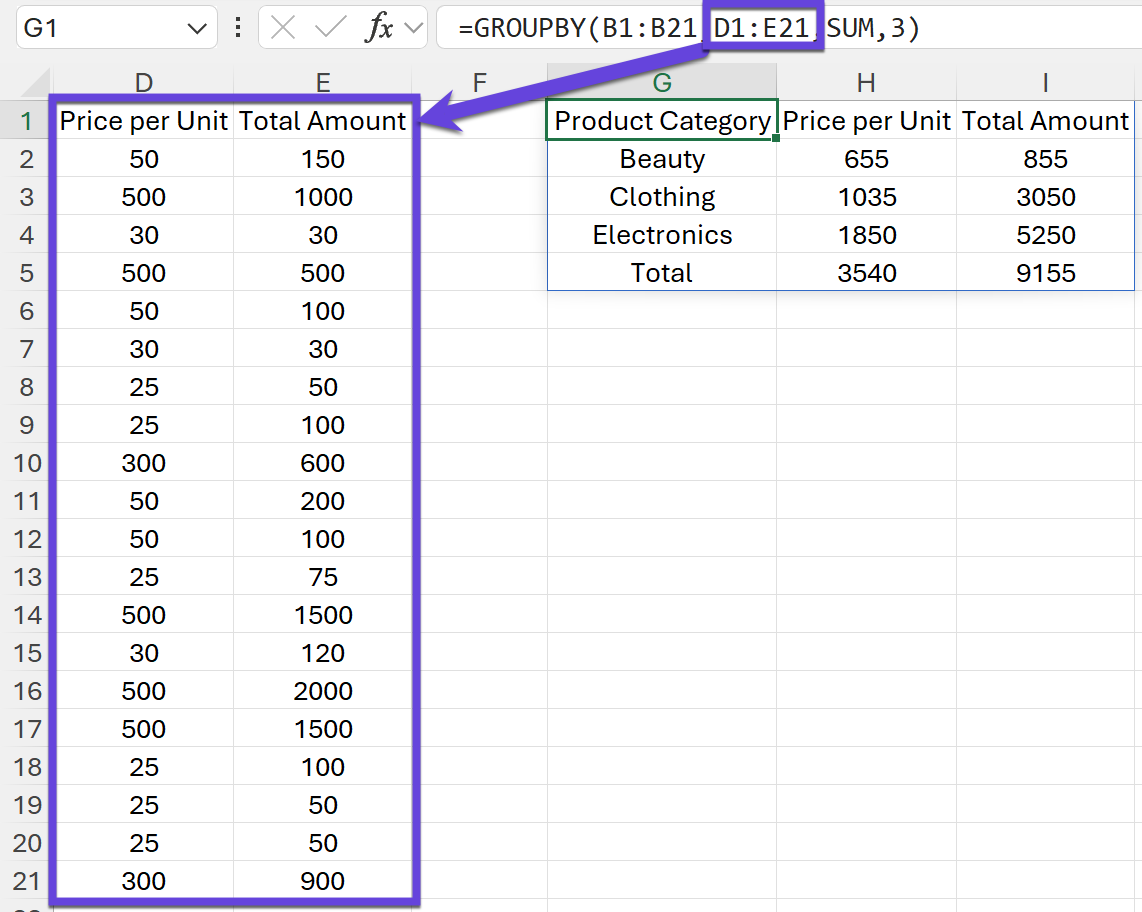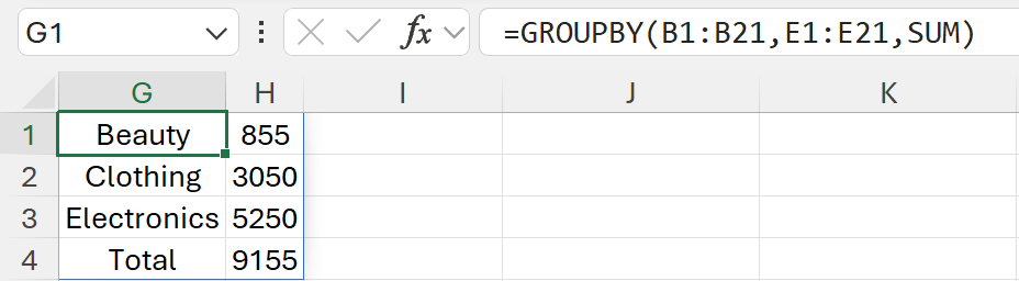 =GROUPBY(B1:B21,E1:E21,SUM)