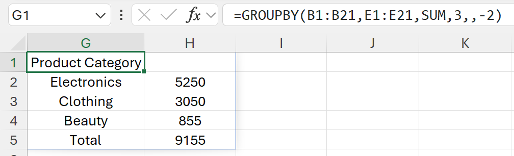=GROUPBY(B1:B21,E1:E21,SUM,3,,-2,B1:B21<>"Electronics")