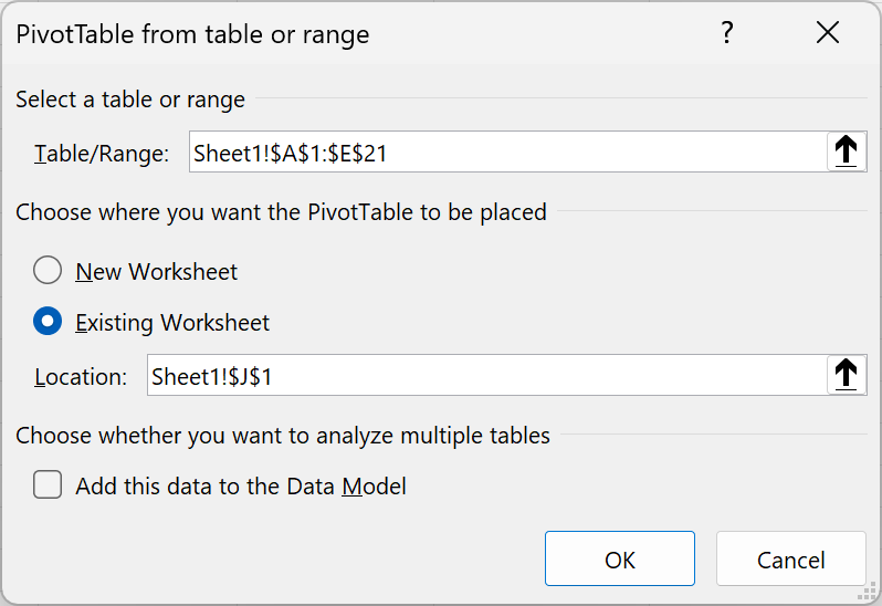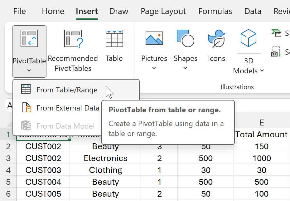 Select anywhere in the data range and on the Insert tab, click PivotTable and then From Table/Range.