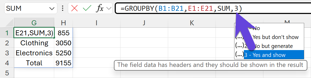 =GROUPBY(row_fields,values,function,[field_headers],[total_depth],[sort_order],[filter_array])