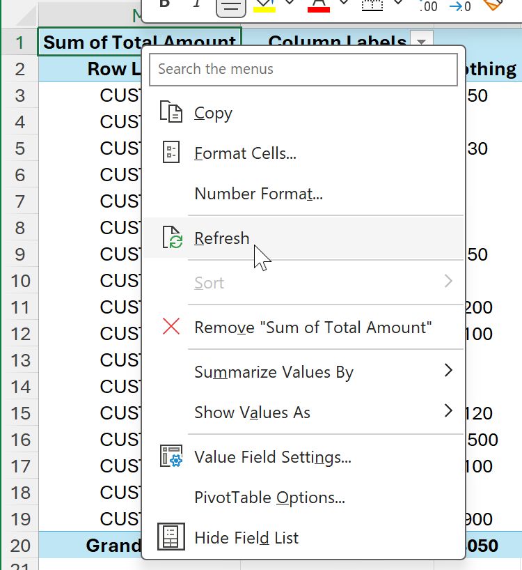 To update it, right-click anywhere on the PivotTable and select Refresh.