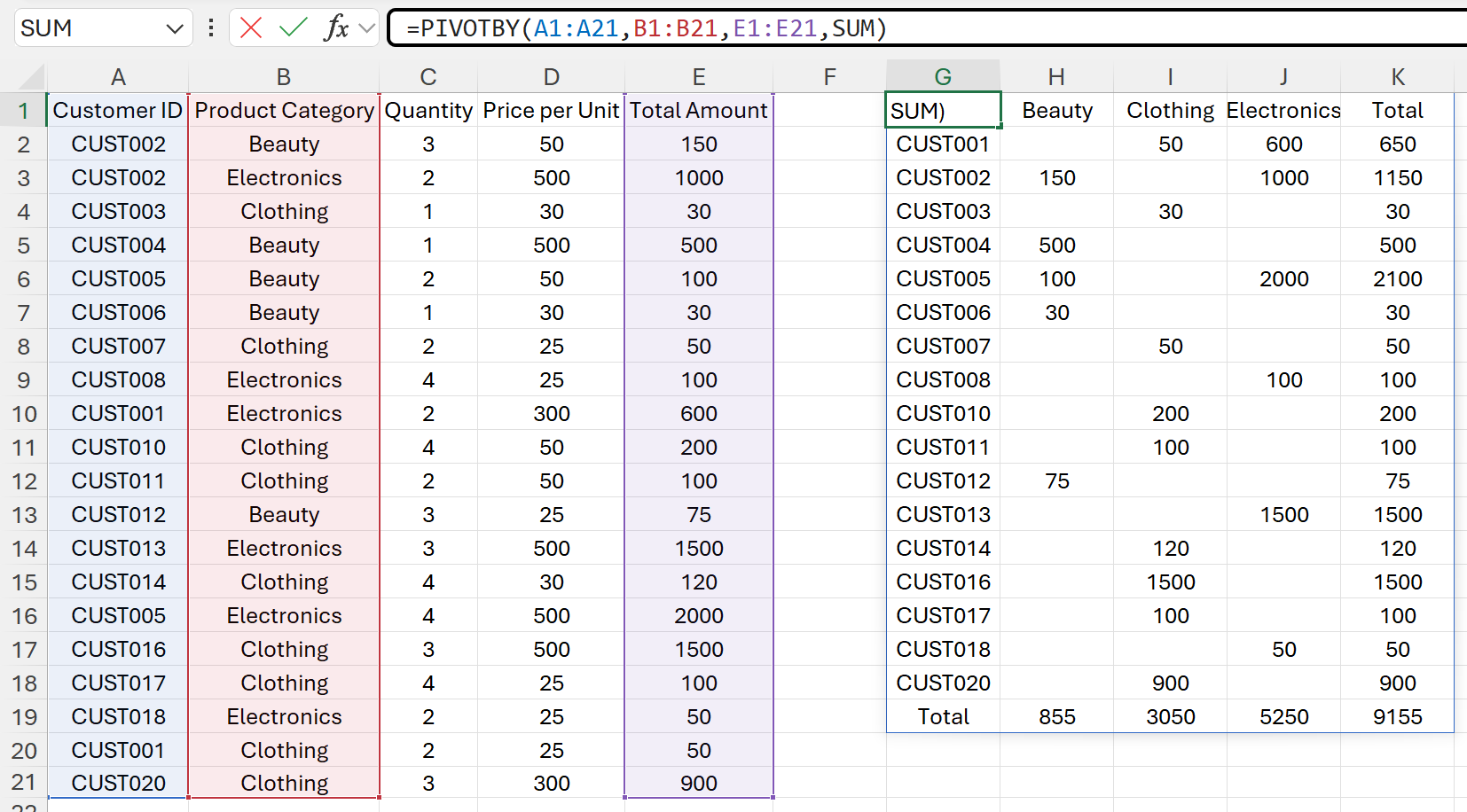 =PIVOTBY(row_fields,col_fields,values,function,[field_headers],[row_total_depth],[row_sort_order],[col_total_depth],[col_sort_order],[filter_array])